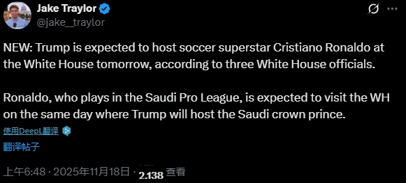 白宫记者:把柄官员音信,好意思国总统特朗普明日将在白宫接待C罗
