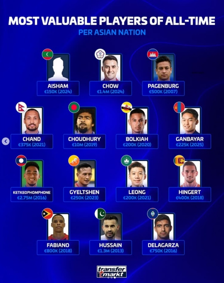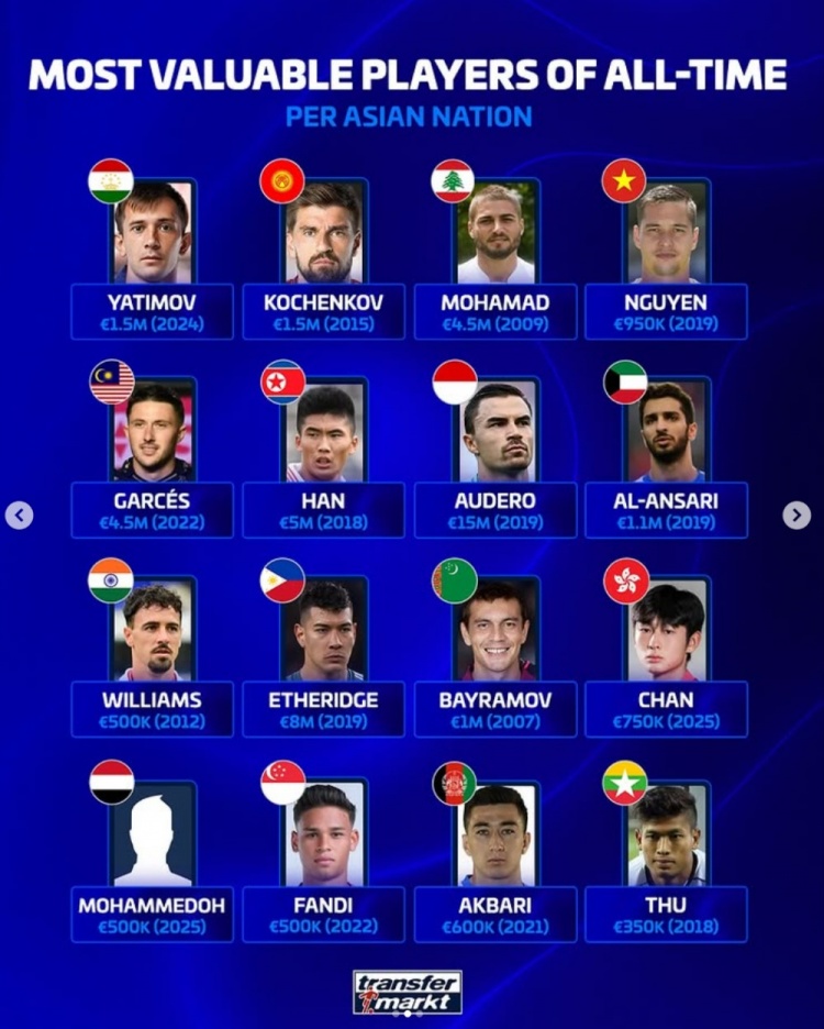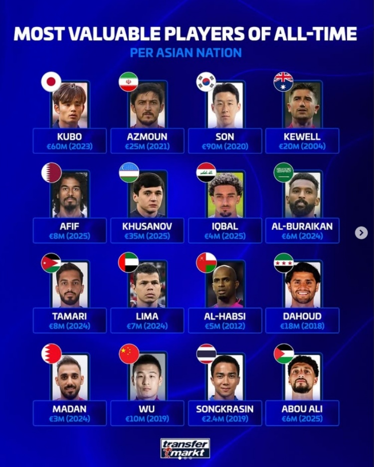以下为亚足联各队历史身价最高球员具体身价情况: