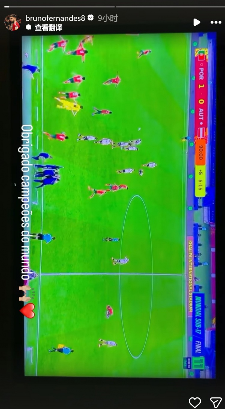 饱读吹后辈!B费社媒祈福葡萄牙U17夺冠:感谢你们,宇宙冠军!